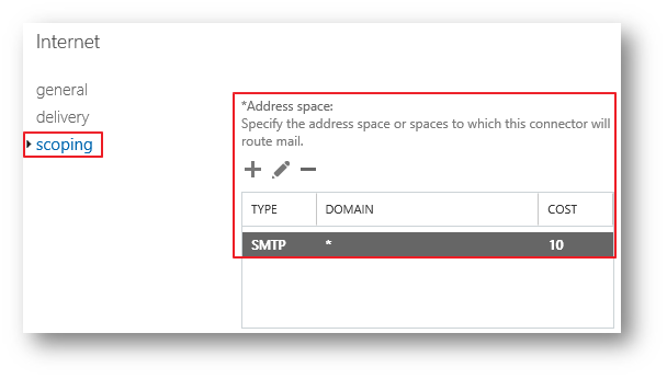 | The address spaces defines the destination domains or other address spaces that are serviced by the connector. When Exchange selects a connector for routing a message, it only considers connectors that have a matching address space. If more than one connector matches the destination address space, the connector with the more precise address match is selected. For example, suppose the recipient is julia@marketing.contoso.com, and separate Send connectors are configured for *, *.contoso.com and marketing.contoso.com. The order of connector preference based solely on the address space is: 1: marketing.contoso.com 2: *.contoso.com 3: * 주소 공간은 커넥터에서 서비스하는 대상 도메인 또는 기타 주소 공간을 정의합니다. Exchange는 메시지 라우팅을 위해 커넥터를 선택할 때 일치하는 주소 공간이 있는 커넥터만 고려합니다. 둘 이상의 커넥터가 대상 주소 공간과 일치하는 경우 주소 일치가 더 정확한 커넥터가 선택됩니다. 예를 들어 받는 사람이 julia@marketing.contoso.com이고 *, *.contoso.com 및 marketing.contoso.com에 대해 별도의 송신 커넥터가 구성되어 있다고 가정합니다. 주소 공간만을 기반으로 하는 커넥터 기본 설정의 순서는 다음과 같습니다. 1: marketing.contoso.com 2: *.contoso.com 3: * |