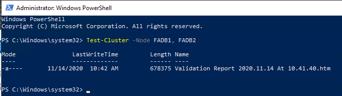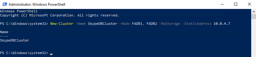 New-Cluster -Name SkypeDBCluster -Node FADB1, FADB2 -NoStorage -StaticAddress 10.0.4.7
