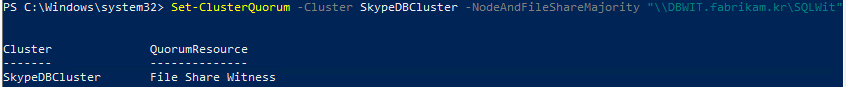 Set-ClusterQuorum -Cluster SkypeDBCluster -NodeAndFileShareMajority “\\DBWIT.fabrikam.kr\SQLWit”