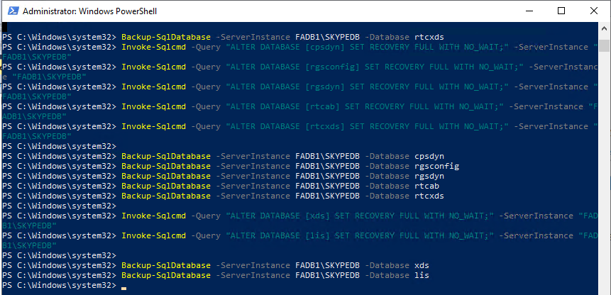 Invoke-Sqlcmd -Query “ALTER DATABASE [rgsdyn] SET RECOVERY FULL WITH NO_WAIT;” -ServerInstance “FADB1\SKYPEDB”