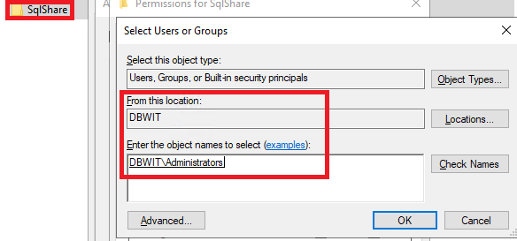 로컬 위치를 지정한 뒤, Administrators 그룹을 지정합니다.