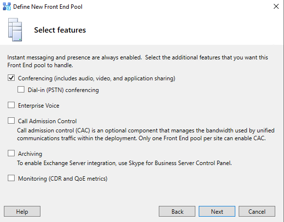 PFX 장비가 없기 때문에 Conferencing 만 체크한 뒤, Next