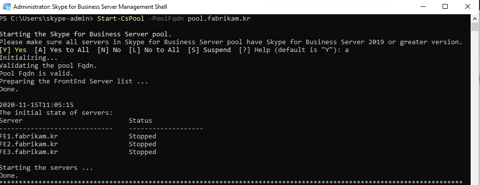 Start-CsPool -PoolFqdn pool.fabrikam.kr