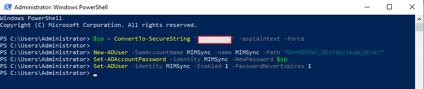 New-ADUser –SamAccountName MIMSSPR –name MIMSSPR -Path "OU=MIMSVC,DC=Fabrikam,DC=kr"