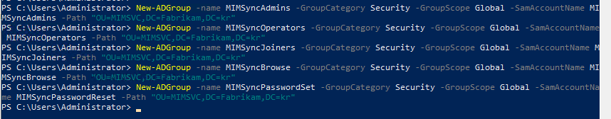New-ADGroup –name MIMSyncOperators –GroupCategory Security –GroupScope Global –SamAccountName MIMSyncOperators -Path "OU=MIMSVC,DC=Fabrikam,DC=kr"