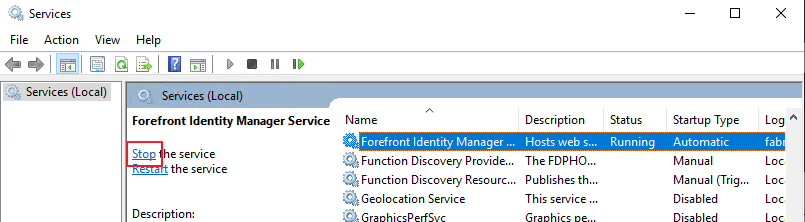 방화벽설정에서 Forefront Identity Manager Service가 활성화되어 있는지 확인합니다.