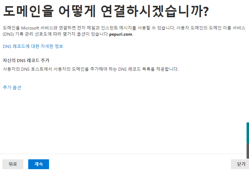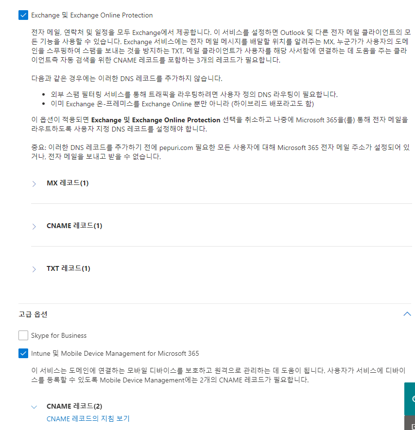 각각의 안내된 레코드 등록절차를 진행합니다. (단 Exchange Hybrid 환경은 일부 레코드 등록절차가 다릅니다.)
