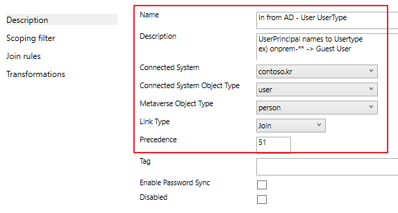 이러한 경우에는 Azure AD Connect로 이미 동기화되어 있더라도, 사용자의 UserPrincipalname(UPN) 을 기준으로 User Type을 Guest로 동기화 할 수 있습니다. (다른 속성값으로도 가능하지만, 공식 기술자료는 UPN 을 기준으로 작성되어 있습니다.) Guest User로 설정되면, 라이선스가 없더라도 Teams에서 제한적 기능을 이용할 수 있습니다.