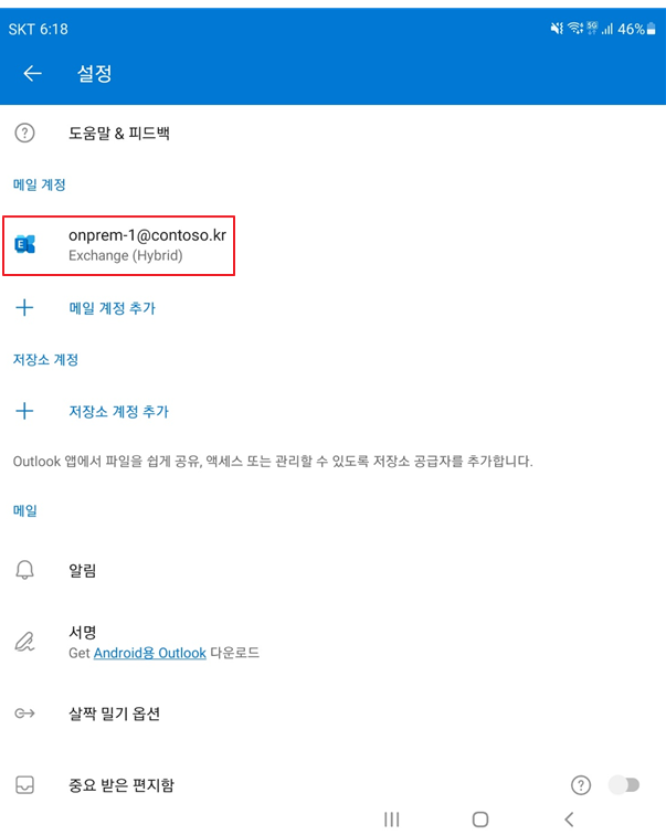 모바일 상에서도 Exchange (Hybrid) 유형으로 추가됩니다.