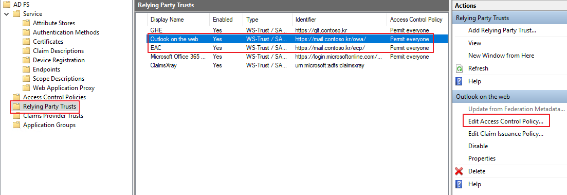 Relying Party Trusts 에서 적용할 항목을 선택 한 뒤, Edit Access Control Policy