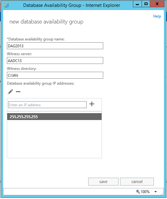 | A server-side database availability group administrative operation failed. Error The operation failed. CreateCluster errors may result from incorrectly configured static addresses. Error: An error occurred while attempting a cluster operation. Error: Cluster API failed: "CreateCluster() failed with 0x200b. Error: The attribute syntax specified to the directory service is invalid". [Server: EX13MBX1.fabrikam.kr] |
