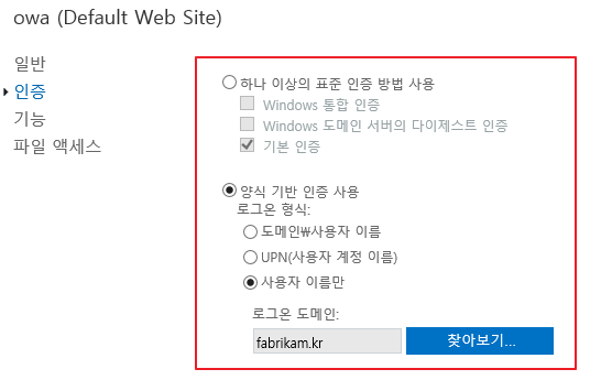 Set-MapiVirtualDirectory -Identity "<서버>\mapi (Default Web Site)" -InternalUrl "https://mail.fabrikam.kr/mapi" -ExternalUrl "https://mail.fabrikam.kr/mapi"