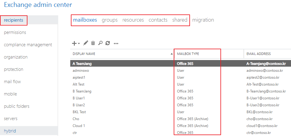 - 하이브리드 배포의 Exchange Online에서 Microsoft 365 또는 Office 365 사서함을 만들면 메일 사용자가 온-프레미스 Active Directory에 만들어집니다. 디렉터리 동기화가 구성된 경우 이 새 사용자 개체를 Microsoft 365 또는 Office 365와 자동으로 동기화하고 Exchange Online에서 클라우드 사서함으로 변환됩니다. Microsoft 365 또는 Office 365 사서함을 일반 사용자 사서함, 회의실 및 장비용 리소스 사서함, 공유 사서함으로 만들 수 있습니다.