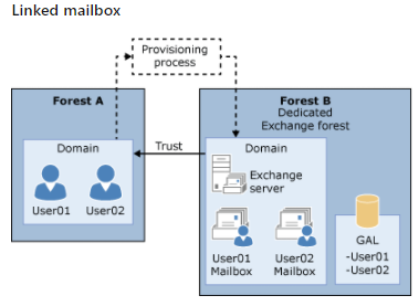 - Linked mailboxes: Linked mailboxes are mailboxes that are accessed by users in a separate, trusted forest. Linked mailboxes may be necessary for organizations that deploy Exchange in a resource forest. The resource forest scenario allows an organization to centralize Exchange in a single forest, while allowing access to the Exchange organization with user accounts in one or more trusted forests. As stated earlier, every mailbox must have a user account associated with it. However, the user account that accesses the linked mailbox doesn't exist in the forest where Exchange is deployed. Therefore, a disabled user account that exists in the same forest as Exchange is associated with each linked mailbox. The following figure illustrates the relationship between the linked user account used to access the linked mailbox and the disabled user account in the Exchange resource forest associated with the linked mailbox.