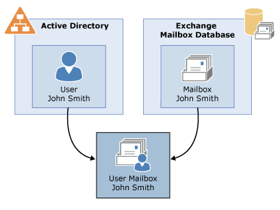| Each mailbox consists of an Active Directory user and the mailbox data that's stored in the Exchange mailbox database (as shown in the following figure). All configuration data for the mailbox is stored in the Exchange attributes of the Active Directory user object. The mailbox database contains the actual data that's in the mailbox associated with the user account. 각 사서함은 Active Directory 사용자와 다음 그림과 같이 Exchange 사서함 데이터베이스에 저장된 사서함 데이터로 구성됩니다. 사서함의 모든 구성 데이터는 Active Directory Exchange 특성에 저장됩니다. 사서함 데이터베이스에는 사용자 계정과 연결된 사서함에 있는 실제 데이터가 포함됩니다. |