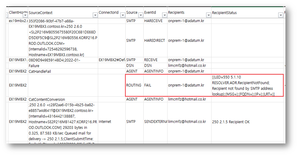 Message Tracking Log 를 보면 Routing 에서 Fail 이 확인되고 RecipientNotFound; Recipient not found by SMTP address lookup이 확인됩니다.