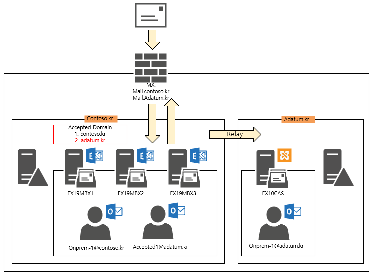 우선 Accepted domain 은 contoso.kr 만 등록된 상황에서 테스트 진행