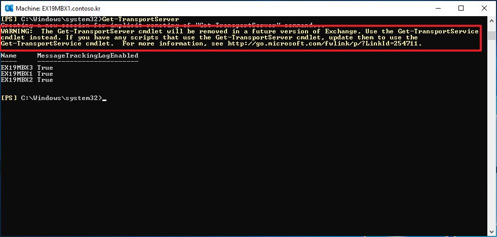 Get-TransportServer 명령어도 없어질 것이라는 경고창도 동일한 맥락입니다.