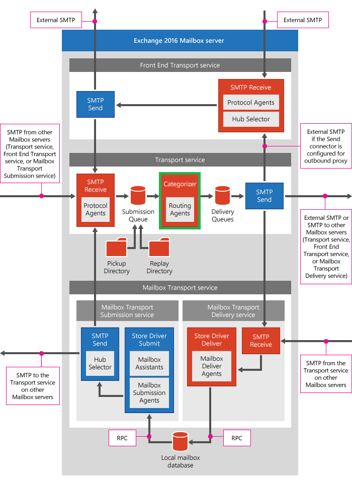 The Mailbox Transport service consists of two separate services: the Mailbox Transport Submission service and Mailbox Transport Delivery service. The Mailbox Transport Delivery service receives SMTP messages from the Transport service, and connects to the local mailbox database by using RPC to deliver the message. The Mailbox Transport Submission service connects to the local mailbox database by using RPC to retrieve messages, and submits the messages over SMTP to the Transport service. The Mailbox Transport service is stateless, and doesn't use message delivery queues.