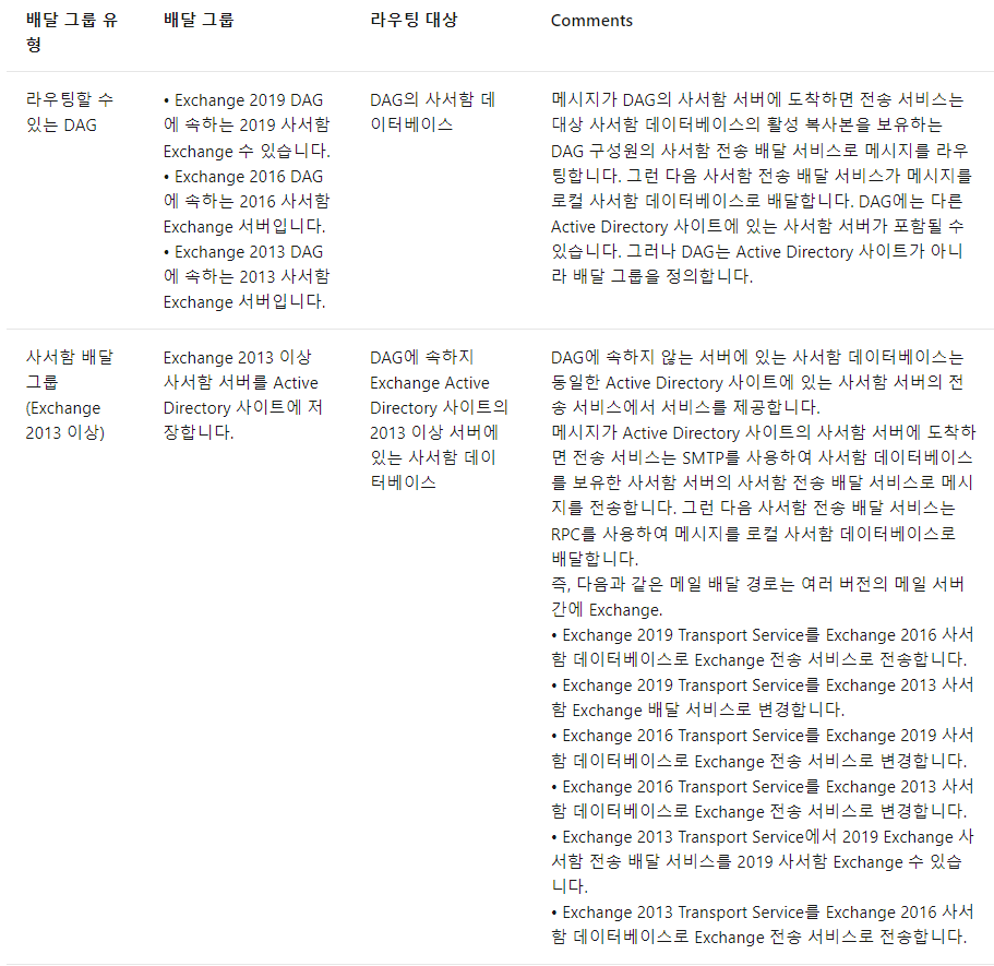 | A collection of one or more transport servers is responsible for delivering mail to each routing destination. This collection of transport servers is called a delivery group. The term transport servers is used because the servers could be a mixture of Exchange 2013 or later Mailbox servers (the Transport service) or Exchange 2010 Hub Transport servers. The relationship between routing destinations and delivery groups is explained in the following table: 하나 이상의 전송 서버 모음은 각 라우팅 대상으로 메일을 배달합니다. 이 전송 서버 모음을 배달 그룹 이라고 합니다 . 전송 서버 라는 용어 는 서버가 Exchange 2013 이상 사서함 서버(전송 서비스) 또는 Exchange 2010 허브 전송 서버가 혼합되어 있을 수 있기 때문에 사용됩니다. 라우팅 대상과 배달 그룹 간의 관계는 다음 표에 설명되어 있습니다. |