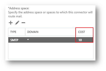 | You use the cost value on the address space for mail flow optimization and fault tolerance when the same address space is configured on multiple connectors. A lower cost value indicates a preferred connector. 동일한 주소 공간이 여러 커넥터에 구성된 경우 메일 흐름 최적화 및 내결함성을 위해 주소 공간의 비용 값을 사용합니다. 낮은 비용 값은 선호하는 커넥터를 나타냅니다. |