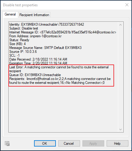 | Last Error: A matching connector cannot be found to route the external recipient Queue ID: EX19MBX3\Unreachable Recipients: limcmfz@hotmail.co.kr;2;2;A matching connector cannot be found to route the external recipient;16;<No Matching Connector>;0 |