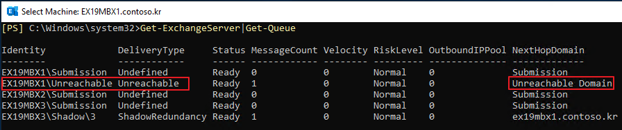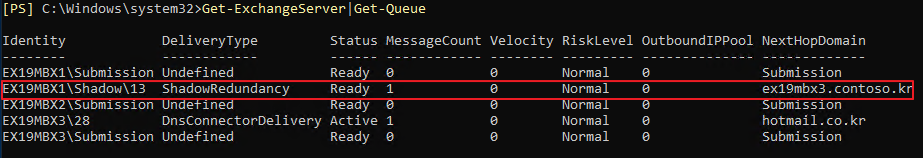 Get-ExchangeServer|Get-Queue 명령어를 통해서 전체 큐 상태를 확인할 수 있습니다.