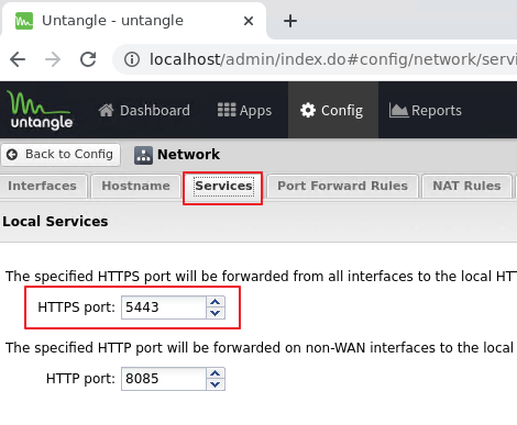 Services 탭으로 이동한 뒤, HTTPS port를 변경합니다. (해당 설정을 변경해야 443 포트에 대한 포트 포워딩을 사용할 수 있습니다.