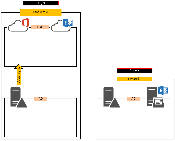 예를 들면 Litware라는 회사가 있는데 fabrikam이라는 회사가 분사하여, 사서함이 이동이 필요할때 고려해 볼 수 있는 시나리오입니다. 처음부터 On-Premise 를 사용했으면 모르겠지만, 신규 법인의 경우에는 Exchange Online을 사용하는 것이 효율적일 수 있습니다.
