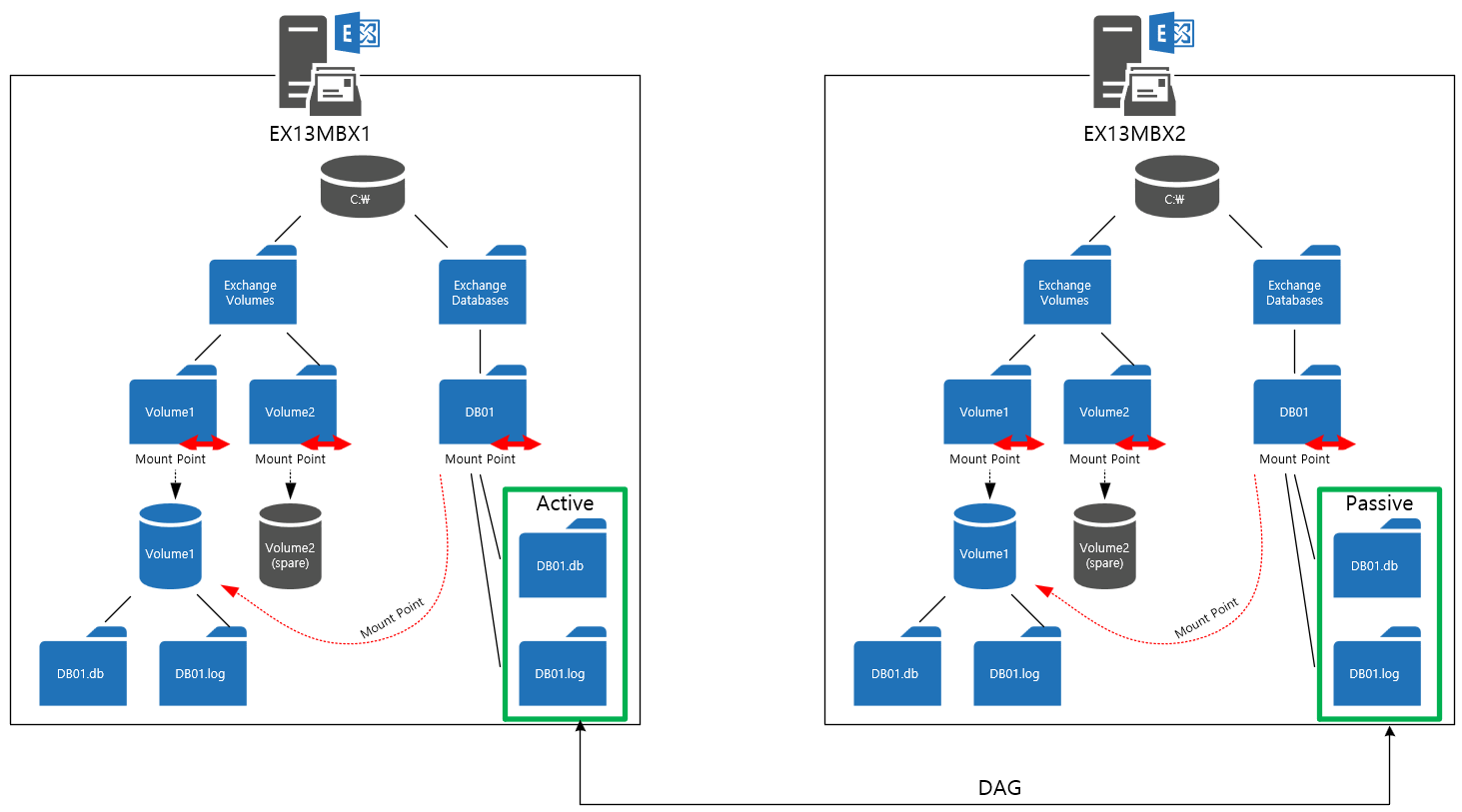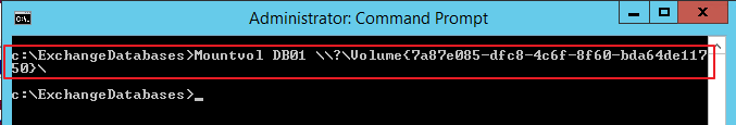 ExchangeDatabases 경로에서 다음 명령어로 해당 볼륨과 맵핑합니다.