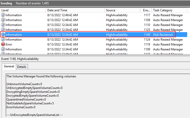 | Event ID 1149, High Availability, Disk Reclaimer The Volume Manager found the following volumes: UnknownVolumeCount=0 UnEncryptedEmptySpareVolumeCount=0 EncryptingEmptySpareVolumeCount=0 EncryptedEmptySpareVolumeCount=0 QuarantinedVolumeCount=0 NotUsableAsSpareVolumeCount=5 ErrorVolumeCount=0 ---UnEncryptedEmptySpareVolumeList--- ---EncryptingEmptySpareVolumeList--- ---EncryptedEmptySpareVolumeList--- ---QuarantinedVolumeList--- ---NotUsableAsSpareVolumeList--- ( \\?\Volume{773ad62d-a2ab-47ea-9357-1a785846adb1}\ ) C:\ ( \\?\Volume{f7c200d8-097f-448d-a24e-3eaa47a06105}\ ) D:\ ( \\?\Volume{b612acb2-38a8-4398-916f-99c5c945c773}\ ) E:\ ( \\?\Volume{f14d4dcf-0417-47fc-a2e4-0942cc0df818}\ ) C:\ExchangeVolumes\Volume2\ ( \\?\Volume{a82f4b68-00e3-4ed1-a223-a41503ef61ce}\ ) C:\ExchangeDatabases\DB01\ ---ErrorVolumeList--- ---UnknownVolumeList--- |