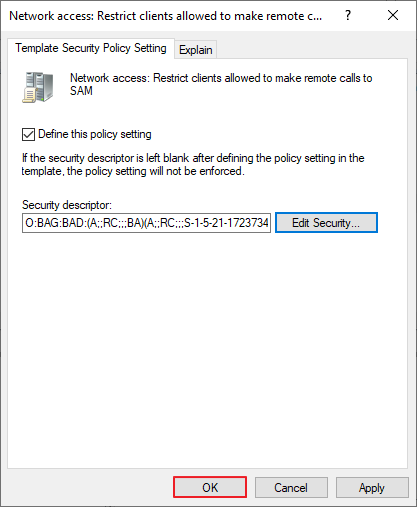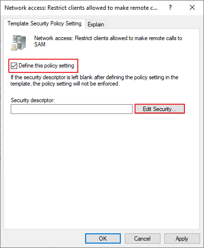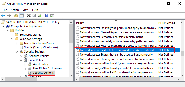 Computer Configuration -> Policies -> Windows Settings -> Security Settings -> Local Policies -> Security Options -> Network access – Restrict clients allowed to make remote calls to SAM