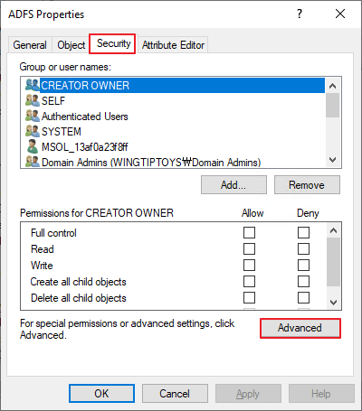Active Directory Users and Computer -> Program Data -> Microsoft -> ADFS -> 우클릭 -> Properties