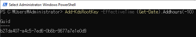 Add-KdsRootKey -EffectiveTime (Get-Date).Addhours(-10)