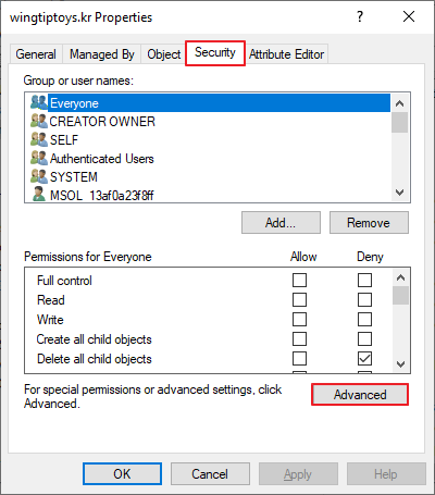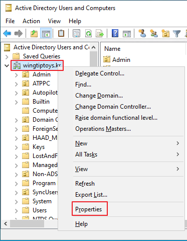 Active Directory Users and Computers -> 도메인 -> 우클릭 -> Properties