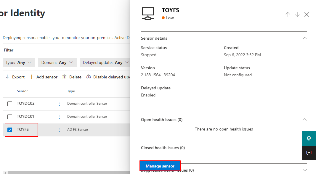 ADFS 머신 선택 -> Manage Sensor