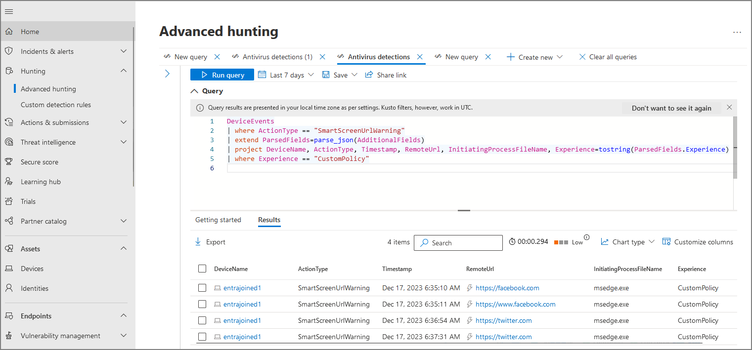 | project DeviceName, ActionType, Timestamp, RemoteUrl, InitiatingProcessFileName, Experience=tostring(ParsedFields.Experience)