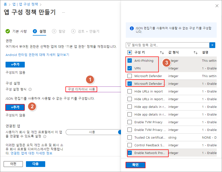 추가 -> Defender에 필요한 설정을 추가합니다. -> 확인