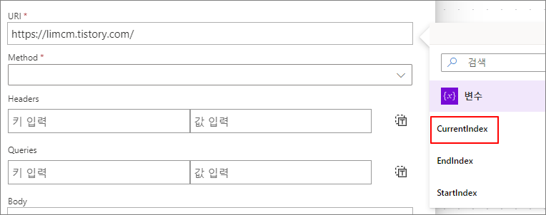 사이트 및 폴더 경로 지정, 파일 이름은 CurrentIndex.html 동적 형태로 지정. 파일 콘텐츠는 HTTP에서 호출되는 Body를 지정합니다.