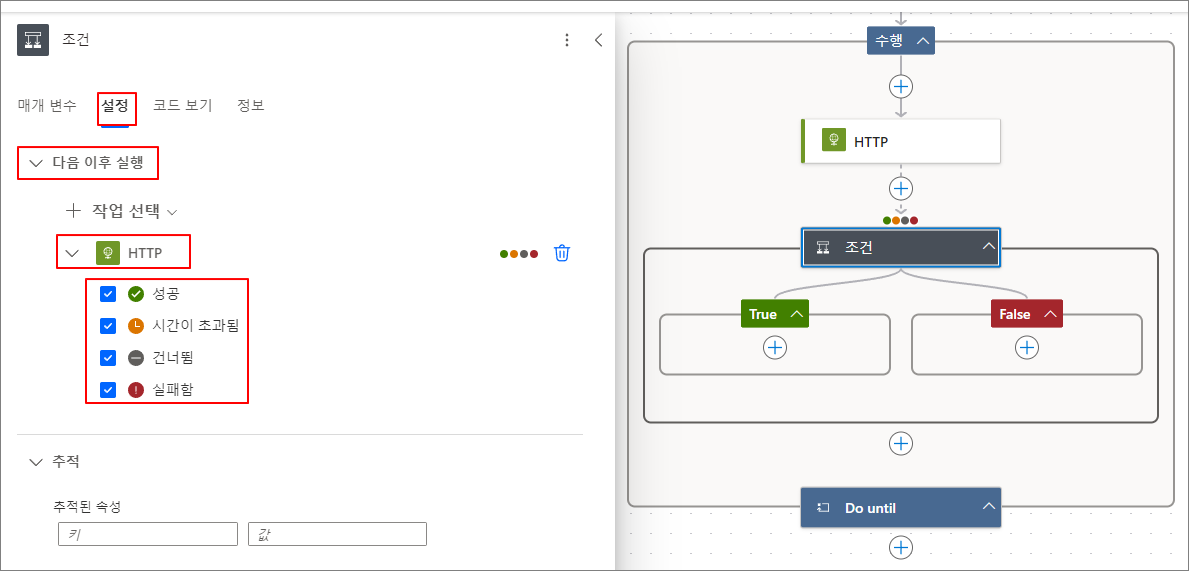 설정 -> 다음 이후 실행 -> HTTP에서 4가지 상태를 전부 지정합니다.