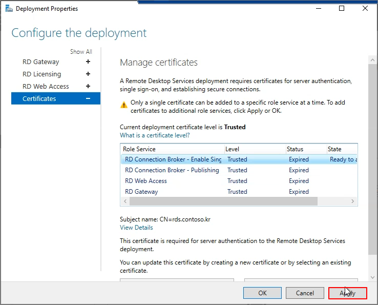 이번에 RDS 서버의 인증서가 만료되었습니다. 아래와 같이 갱신작업을 진행하였습니다.