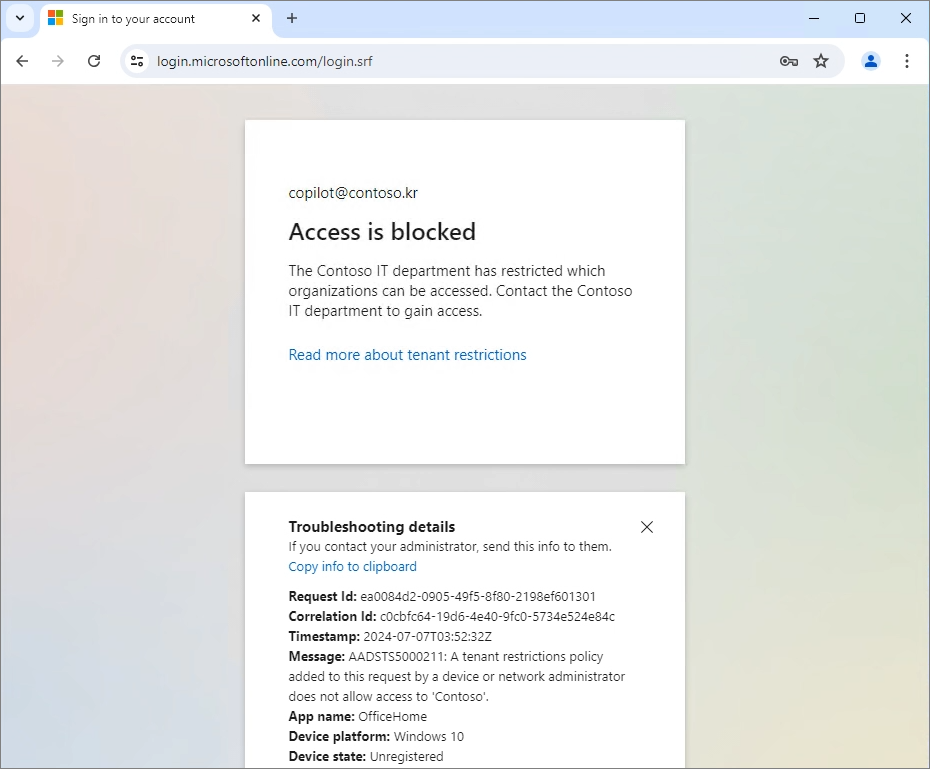Chrome에서 다른 테넌트로 로그인하면 아래와 같이 차단되는 것을 확인할 수 있습니다.