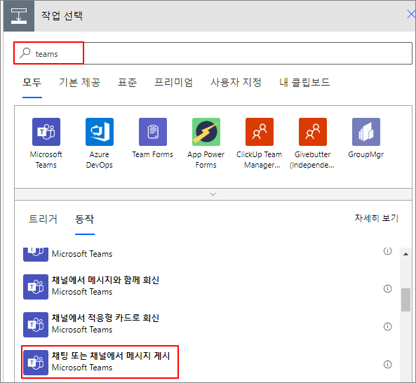 Teams 검색 -> 채팅 또는 채널에서 메시지 게시