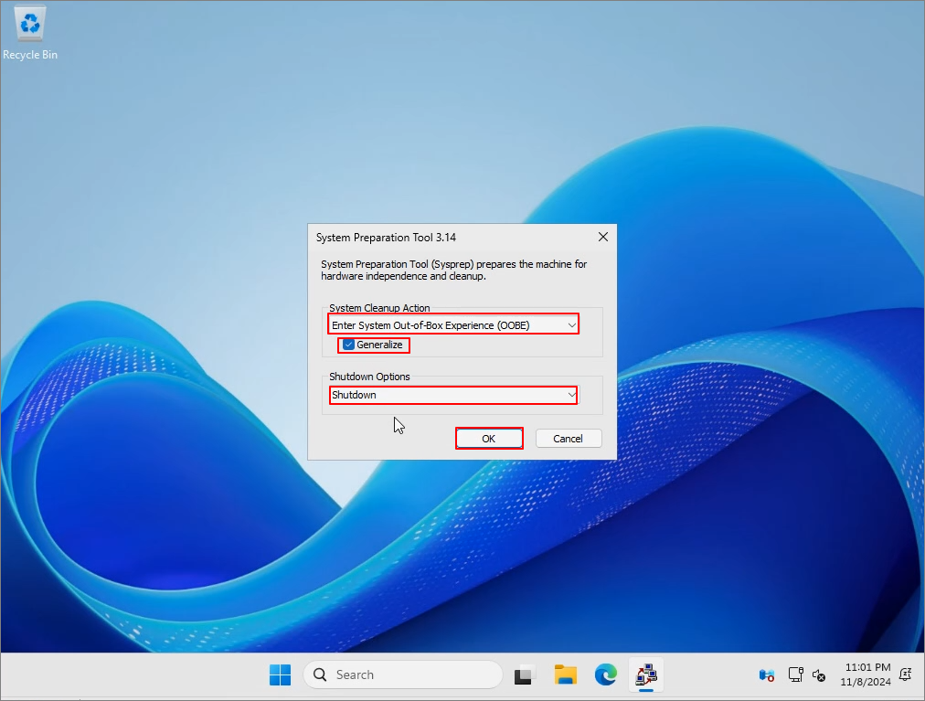재부팅이 진행되고 다음과 같이 화면이 나타납니다. OOBE, Generalize, Shutdown 을 선택한 뒤, OK를 클릭합니다.