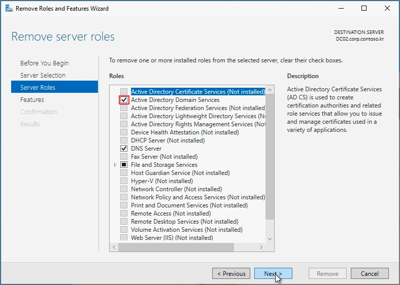 재부팅후 다시 역할 제거 메뉴로 이동하여 ADDS 제거 과정 진행