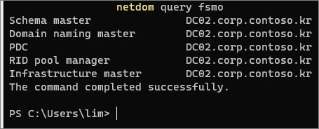 아래의 명령어를 입력하여 DC Master 역할을 DC02로 변경합니다.