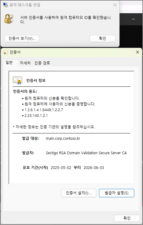 더 이상 원격 연결할 때, 인증서 경고 메시지가 나타나지 않으면서 연결됩니다.