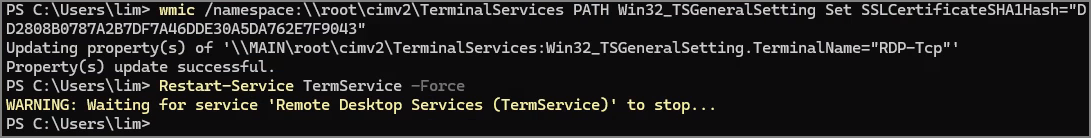 wmic /namespace:\\root\cimv2\TerminalServices PATH Win32_TSGeneralSetting Set SSLCertificateSHA1Hash="THUMBPRINT값 입력"