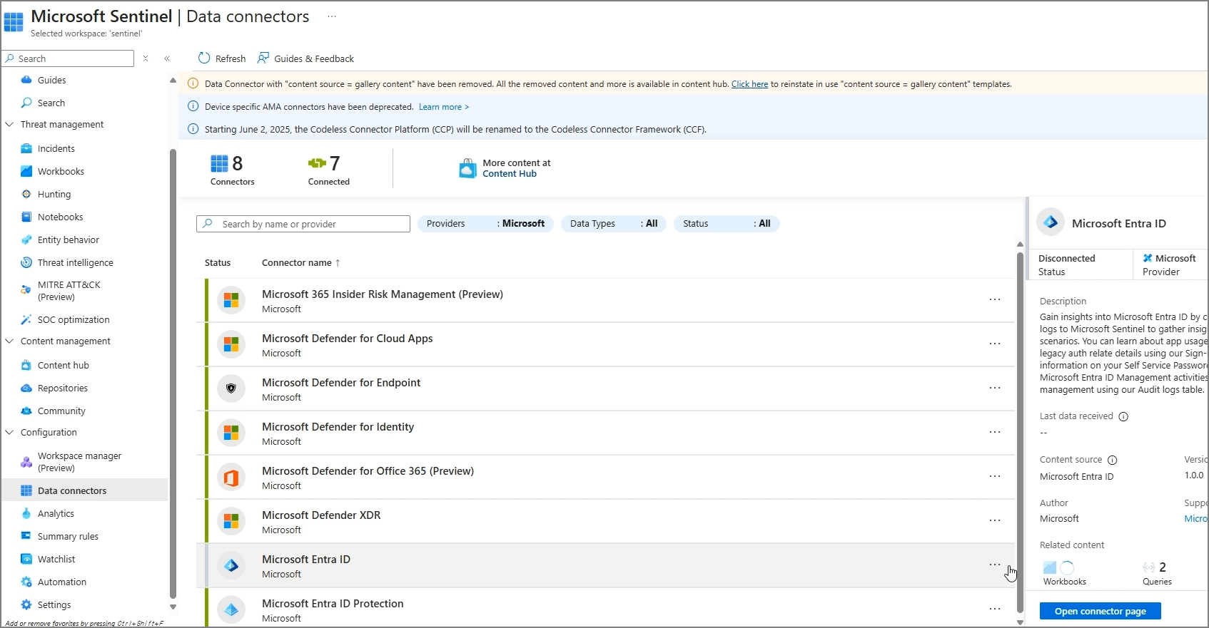 Data Connectors -> Microsoft Entra ID -> Open connector page