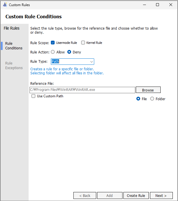 SignedAndReputable + 주요 실행 경로 Allow + 특정 위험 앱 Deny